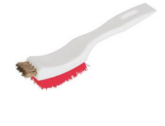 For Removing Paint, Varnish And Stain And Cleaning Tile, Grout, Stoves And Small Parts. Bottom 6 Rows Of Crimped White Polypropylene, Trimmed 5/8". Top 3 Rows Of Crimped Brass Wire, Angled From Tip, Trimmed 1/2". Handle 7" Sturdy Molded Plastic In Assorted Colors With Hanging Hole.
