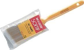 White nylon/gold polyester synthetic blend for all paints, latex and oil-based. Soft brush tips provide a smooth, even finish. Pearl-yellow solid plastic handle. Brass-plated steel ferrule, chisel trim.