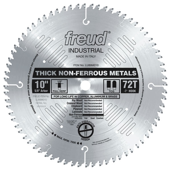 This heavy-duty, non-ferrous metal cutting blade produces an excellent finish. These blades have custom designed gullets to minimize chip build-up and specially formulated carbide for long life. Freud recommends use of a liquid lubricant when cutting. This can be accomplished with a spray of WD-40 or other lubricant every 4 to 5 cuts. Wax sticks are not recommended
