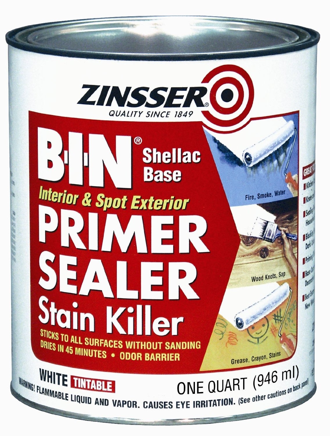 B-I-N is the original pigmented shellac stain-killing primer-sealer. Great for knots, water stains, fire and smoke damage. Best interior new wood primer. Dries in minutes; recoat in 45 minutes. Seals in tough stains, pet, smoke and fire odors. Great under all topcoats.