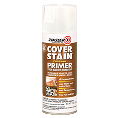 Zinsser B-I-N 13-oz. Spray Shellac-Based White Interior and Spot Exterior Primer and Sealer can be used in low temperatures and sticks to any surface without sanding. The primer seals stains from water, smoke and fire damage. It also stops bleeding knots and sap streaks. Dries to the touch in just 20 minutes. Recoat after 45 minutes.