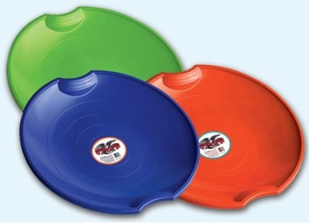 (1)626 Flying Saucer Snow Sled 26" Round **SLEDS SOLD EACH**** Molded in hand grips Ages 4 and up (Beginner to Adult *MADE IN THE USA* Three Colors ,Green , Blue ,Orange Please list The color of choice in preference as 1st choice 2nd choice 3d choice,,,Sled wrapped in clear plastic for shipping..