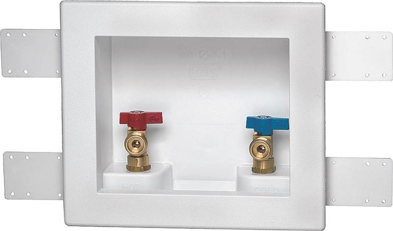 Quadtro quarter-turn valves, copper sweat. Can be used in commercial or residential applications which require supply valve and waste drain recessed into the wall. Versatile design allows for right, left, or center drain and bottom or top mount valves. Easily installed and removed test cap does not fall into drain. 2" drain opening fits PVC or ABS Sch 40 DWV pipe. 1/4 turn brass ball valve. Copper sweat. Box made of high impact polystyrene, 4 support brackets included for mounting. Snap-on faceplate frame accomodates up to 1 in.