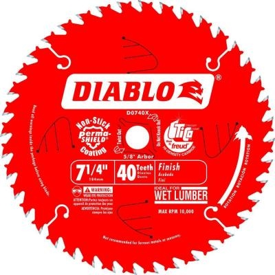 The Diablo 7-1/4 in. x 40 Tooth Carbide Circular Saw Blade contains Perma-Shield coating to protect against heat, gumming and corrosion. The TiCo high-density carbide teeth are durable and strong for fast, accurate wood and plywood cuts.