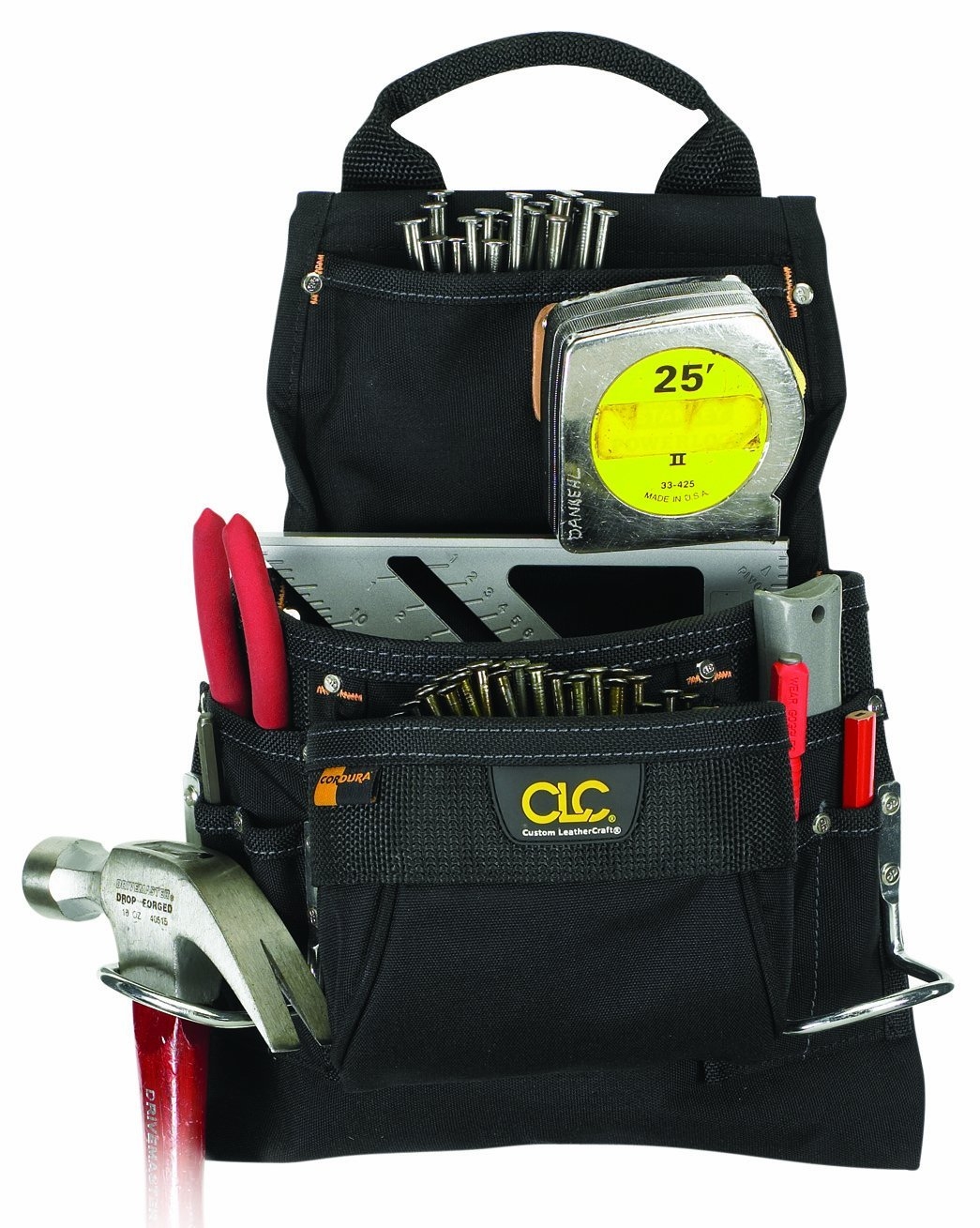 Double layer of rugged, lightweight nylon. STA-OPEN feature on main pockets. 3 Main pockets for tools/nails. 6 Smaller pockets for hand tools, pencils, nail sets, etc. Metal clip holds all measuring tape sizes. 2 Steel hammer loops.