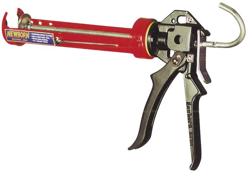 All steel welded construction. Sintered steel friction plate. Effective trigger grip for max trigger action on every stroke, eliminates hand fatigue and prolongs life of gun. Zinc alloy handle. Thumb release for ease. 18:1 thrust ratio. Includes spout cutter, seal puncture tool and ladder hook.