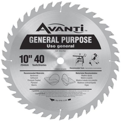 The Avanti 10 in. x 40 Tooth General-Purpose Circular Saw Blade is an economical, high-performance blade that's recommended for wood and pressure-treated beams. The high-quality steel is manufactured with carbide and lasts up to 30 times longer than regular steel blades. The blade can be sharpened when needed for extended service life.