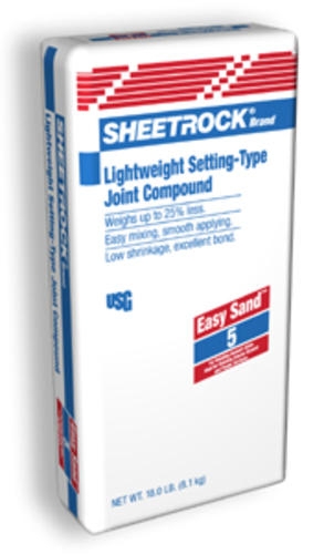 SHEETROCK® Easy Sand 5 Lightweight Setting-Type Joint Compound is a chemically-setting compound for interior gypsum panels and exterior gypsum ceiling boards that has an approximate set time of five minutes. The joint compound mixes easily with water and weighs 25% less than conventional setting-type joint compounds for easy handling. It can be used for a variety of applications including: filling, smoothing and finishing interior concrete ceilings and above-grade concrete; taping and finishing panels in bathroom areas; and finishing joints in protected exterior soffits.