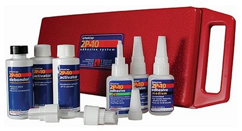 2P-10 is a two-part, 10 second bond adhesive. Just apply the adhesive, spray with activator, and press together for a strong permanent bond. 2P-10 is available in four different viscosities:Jel for vertical surfaces where you want the glue to stay put. Thick for bonding porous surfaces like particleboard. Medium for smooth surfaces and filling cracks. Thin for nonporous surfaces like ceramics. Debonder is used to remove unwanted glue residue. Kit contains 1 oz. each of Jel, Thick and Medium Adhesives for bonding different surfaces, 2 oz. Activator for a fast permanent bond, and 2 oz. Debonder for removing glue residue. All in a plastic storage and travel case.