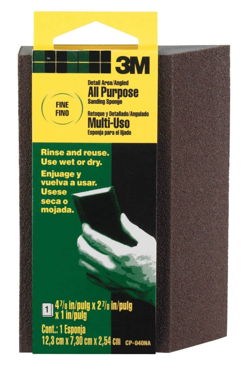 3M Sanding Sponge CP040-12-CC Single Angle, 4.875-Inch by 2.875-Inch by 1-Inch, Fine grit. For detailed area. Rinse and reuse. Use wet or dry. For large areas and detail sanding. 3M(TM) Sanding Sponges are designed for wet or dry sanding on wood, paint, metal, plastic or drywall. Use this fine-grit sponge for smoothing patch and repair on walls and for between coat finishing to improve adhesion of additional coatings. This sponge features conventional 3M abrasives and is made with durable, flexible foam. Sanding is an integral step in preparing a surface to receive a coating. For the best sanding results, sand with the grain of the surface and work through a sequence of grits, from coarse to very fine, skipping no more than one grit between each sanding step. 3M sanding sponges are available in medium, fine and extra fine grits.
