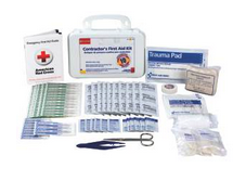 Kit Contains: (100) 1" X 3" Adhesive Plastic Bandages, (2) Knuckle Fabric Bandages, (2) Large Fabric Fingertip Bandages, (1) 3" Conforming Gauze Roll Bandage, (1) 40" Triangular Sling/Bandages With Two Safety Pins, (8) 3" X 3" Gauze Dressing Pads, (1) 5" X 9" Trauma Pad, (42) Antiseptic Cleansing Wipes,(6) First Aid/Burn Cream Packs (.9gms), (6) Antibiotic Cream Packs, (1) 4" X 5" Instant Cold Compress, (1) 1/2" X 10 Yd. Tape Roll, (1) Pair Nickel Plated Scissors (4-1/2"), 4" Plastic Tweezers (One Time Use), 2 Pair Exam Quality Gloves And 1 First Aid Guide. Plastic Case With Gasket, 9-1/6" X 6" X 2-3/8". Kits Have Bilingual (English/Spanish) Labels. 25 Person Kit.
