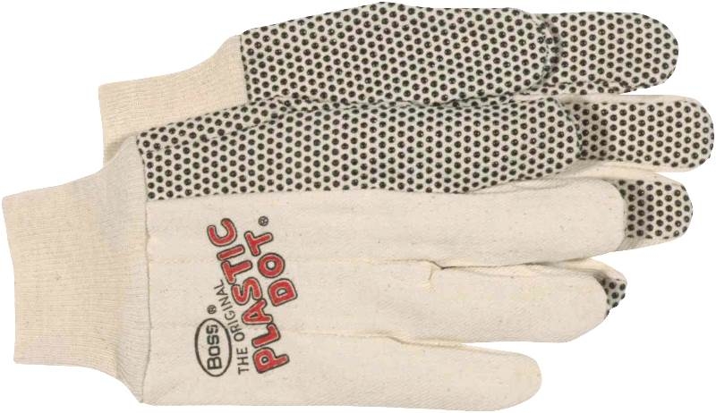 10 oz., 100 percent cotton canvas with plastic dots on palm, index finger, and thumb. Clute-cut design, natural knit wrist.