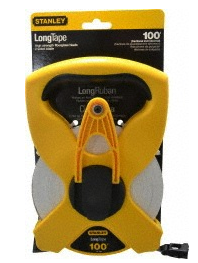 Long Tape Measure, Blade Length 100 ft., Blade Width 1/2 In., Blade Material Fiberglass, Case Type Open, Graduation Type in./ft./Decimal, Graduations 1/8, Case Material ABS Plastic, Belt Clip No, Blade Color Yellow, Case Color Yellow/Black, Features 2-Sided Blade Graphics with Fractional Inch/Decimal Foot Scales, Corrosion-Resistant Tru-Zero Folding End Hook for Accurate Measurements, Handle Type Slip Resistant Rubber Grip, Hook Folding True-Zero(TM), Rewind Type Manual, Stud Markings No.