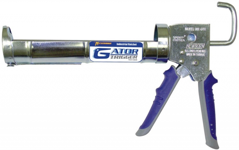 The Newborn 960-GTR Super Ratchet Rod Cradle caulking gun has a steel half-barrel frame that fits 1/10-gal. cartridges and has a 6:1 thrust ratio for use with low to medium viscosity materials such as latex and silicone. The ratchet-style pressure rod has teeth that hold the rod in place after each pull of the trigger. For thinner materials, this helps minimize drips. The zinc chromate plating offers good corrosion resistance. The handle and trigger are padded for comfort. There is a welded plate in the back for securing the cartridge in place. A seal puncture tool and a spout cutter are built into the side of gun for opening cartridges without a knife, and the hook on the back allows it to hang on a ladder.