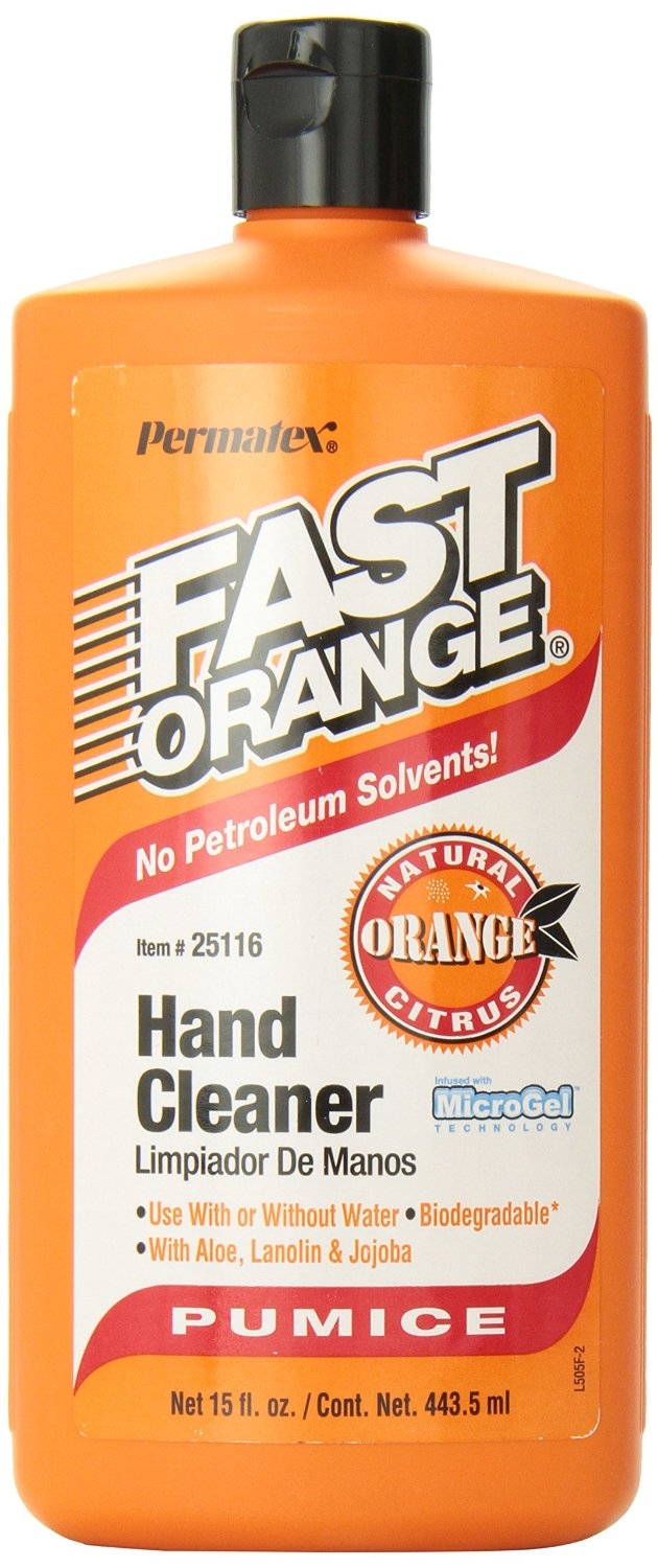 Permatex Fast Orange Pumice Lotion Hand Cleaner is fortified with aloe, lanolin, glycerin, and other skin conditioners, to gently clean the toughest dirt. The biodegradable, waterless, petroleum solvent-free formula contains no harsh chemicals, mineral oils or ammonia that can sting cuts and abrasions. Pure, fresh-smelling, natural citrus power cleans deep down to remove even the most stubborn grease and grime. Removes resins, oil, grease, tar, grime, soil, printers’ ink, epoxies, paint, rubber cement, gasket and tile cements. Also works great on laundry stains, scuff marks, tile floors, pet odors and many other household cleaning needs.