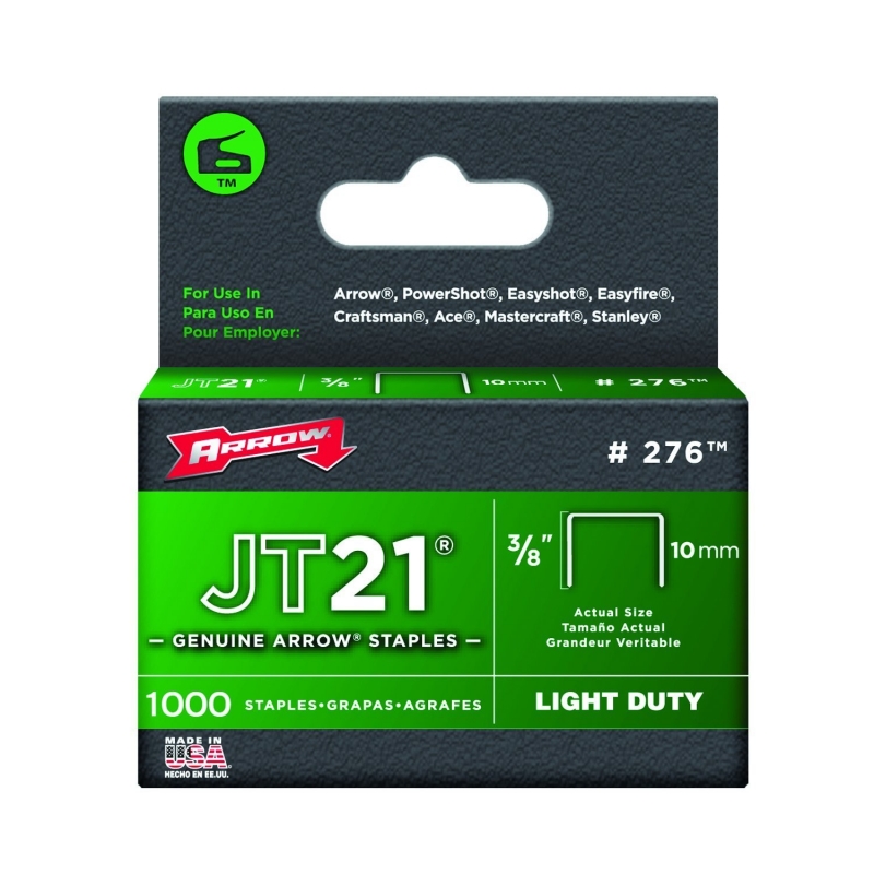 The Arrow JT21 3/8 inch staple, each box has 1,000 pieces.. Narrow Crown thin wire staple, Fits Arrow JT21, JT27, T27, Powershot 5650, most Stanley light duty guns.