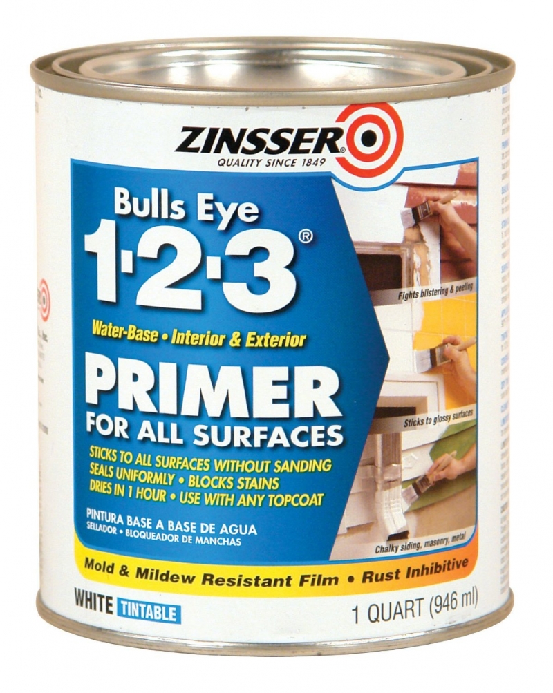 The Zinsser Bulls Eye 1-2-3 Water-Based White Interior/Exterior Primer and Sealer can be used on a variety of surfaces throughout the whole house. It adheres well to glossy surfaces, including tile and enameled trim. The primer inhibits rust on new metal and is ideal for application on alkaline surfaces. The finish seals tannin bleed and resists mold and mildew growth. Its breathable, flexible finish resists blistering and peeling.