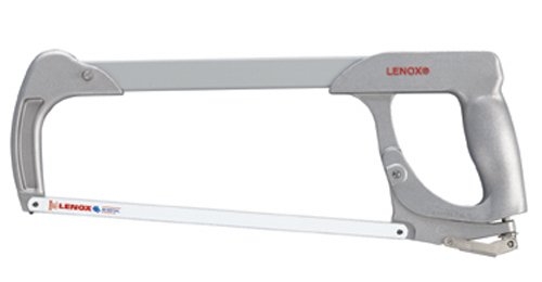 American Saw's Lenox High Tension Hand Hacksaw Frame features a heavy duty aluminum handle, a rectangular steel crossbar, permanent hardened and serrated blade holding pins, a steel tensioning nut, and a fold away tension lever. The frame has a 45 degree blade holder that pins for flush cutting, and the frame can be converted to a jab or compass saw. The blade can be tensioned to 30,000 psi, about twice that of ordinary frames. Spare parts can be stored inside the tubular back. Easy and safe to use, this frame has no blade twisting and resists breakage.